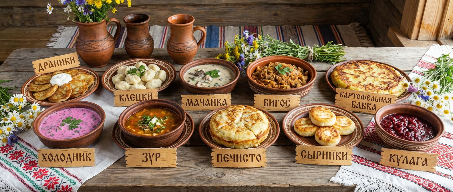 Более 100 новых рецептов по доступным ценам: супы «Тертюха», «Хатний», жаркое «Берестье», бабка картофельная, гульбишник творожный, цыбрики, камяк, шашлык, домашние колбасы и блины с начинками.